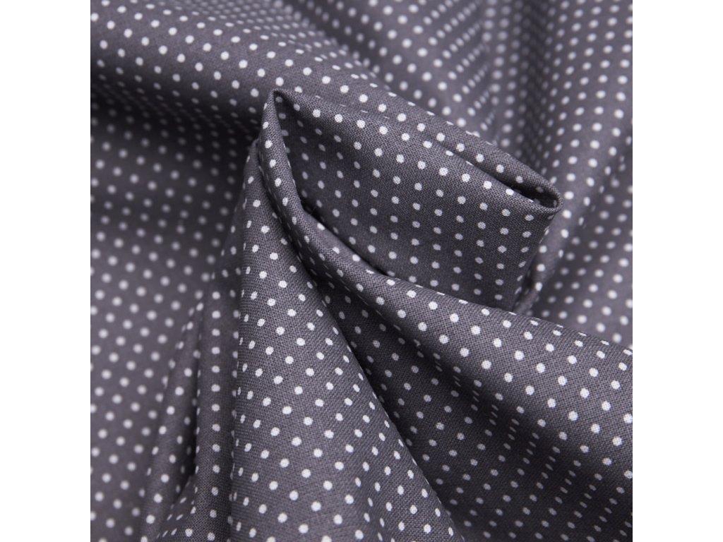 Hustě tkaná bavlněná látka s motivem bílých puntíků na šedém podkladu ze 100% bavlny. Bavlněná látka je v metráži o šíři 160 cm.