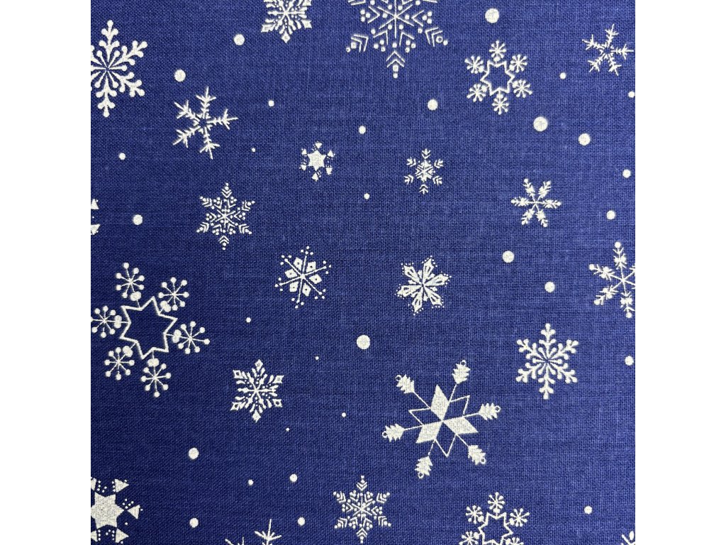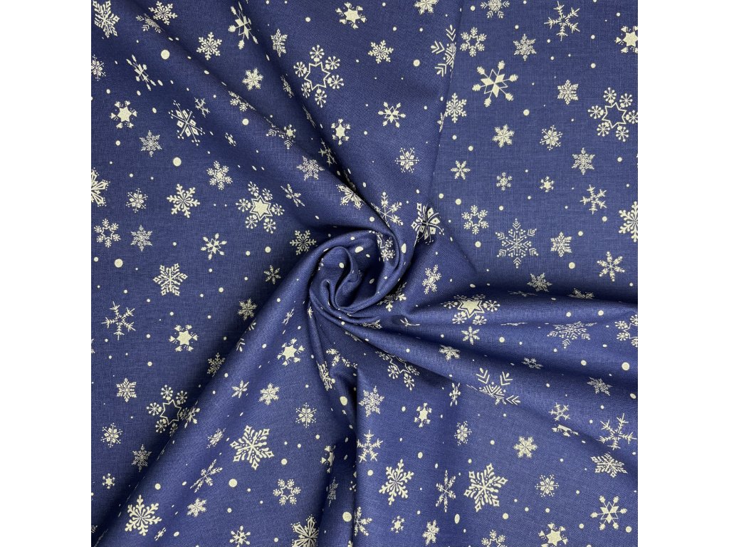 Tato bavlněná látka v sytě modrém odstínu je ozdobena jemným vzorem světlých sněhových vloček, které působí elegantně a slavnostně. Různorodé tvary vloček i drobných puntíků jsou rozmístěny rovnoměrně po celé ploše, čímž vytvářejí dojem zasněžené zimní oblohy. Motiv je detailně propracovaný a díky kontrastu světlého tisku na tmavém podkladu krásně vyniká.