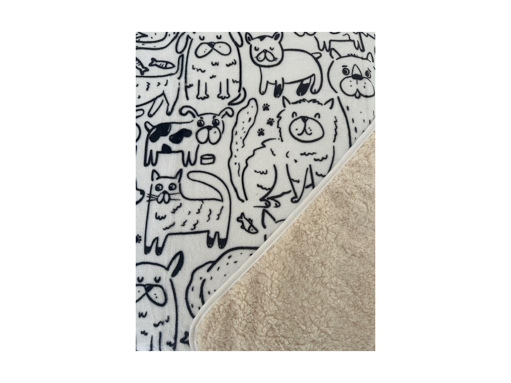 Tato oboustranná deka zaujme moderním černobílým designem s originálním motivem stylizovaných koček a psů v různých hravých pózách, které vytvářejí nápaditý a veselý vzor po celé ploše.