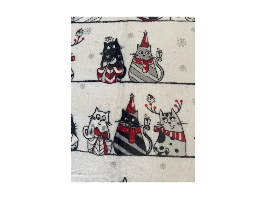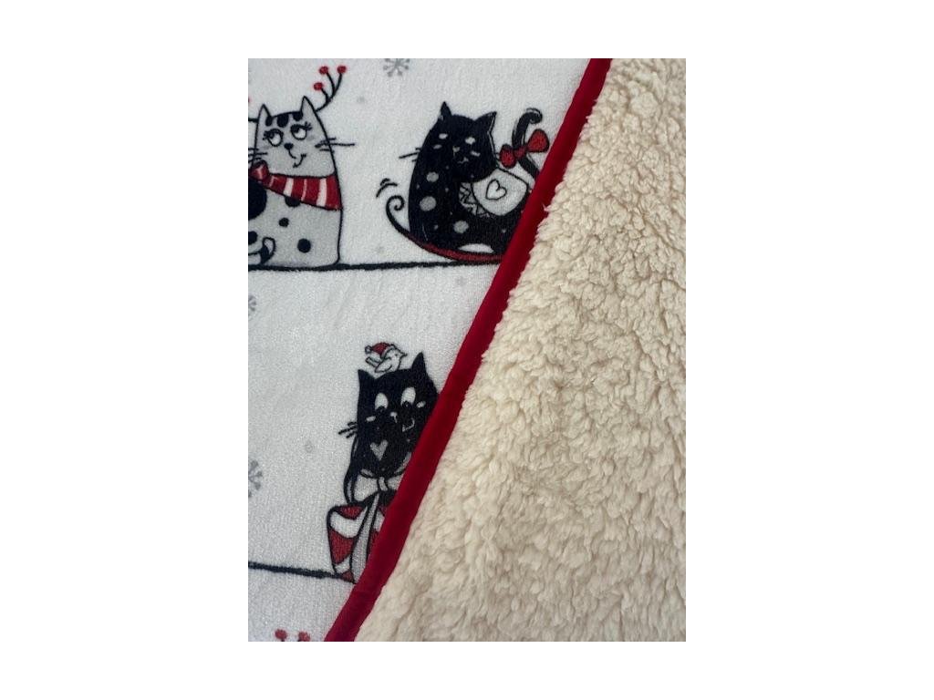 Hebká a hřejivá dětská deka s veselým vánočním motivem roztomilých kočiček v červených doplňcích na světlém podkladu.