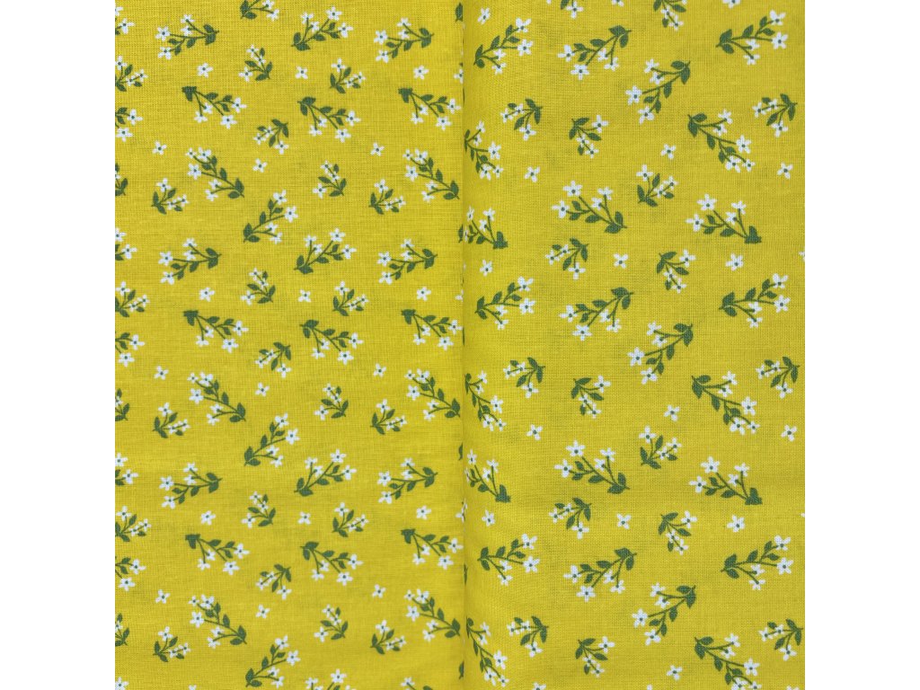 Tato svěží látka v sytém žlutém odstínu zaujme hravým květinovým motivem drobných bílých kvítků doplněných jemnými zelenými lístky.