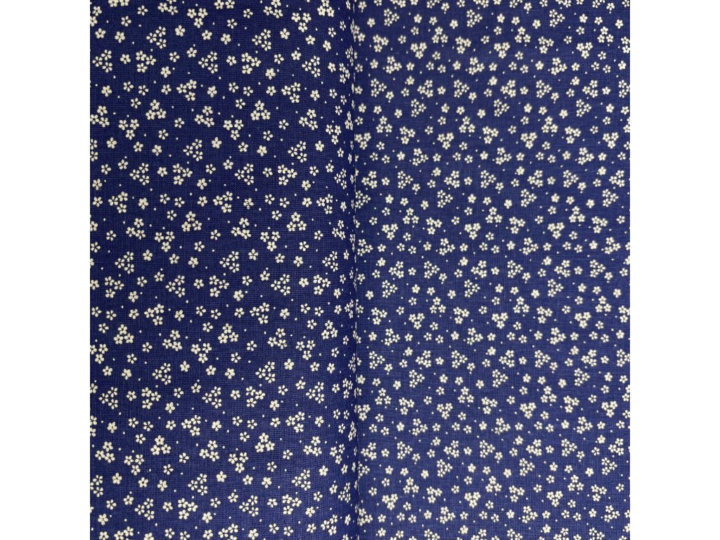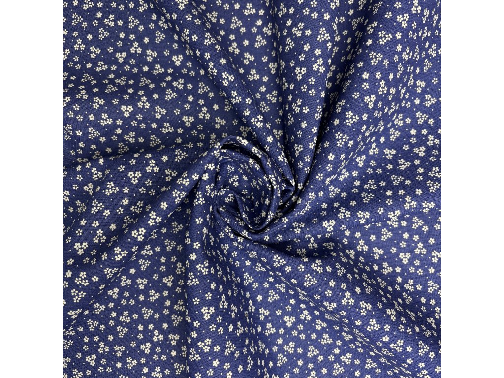 Tato látka v hlubokém tmavě modrém odstínu je zdobena jemným, pravidelně rozptýleným vzorem drobných bílých kvítků, které působí velmi něžně a decentně.