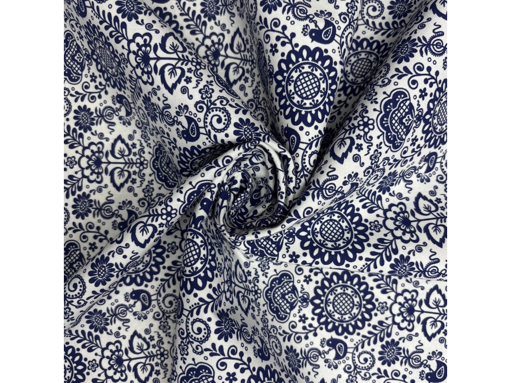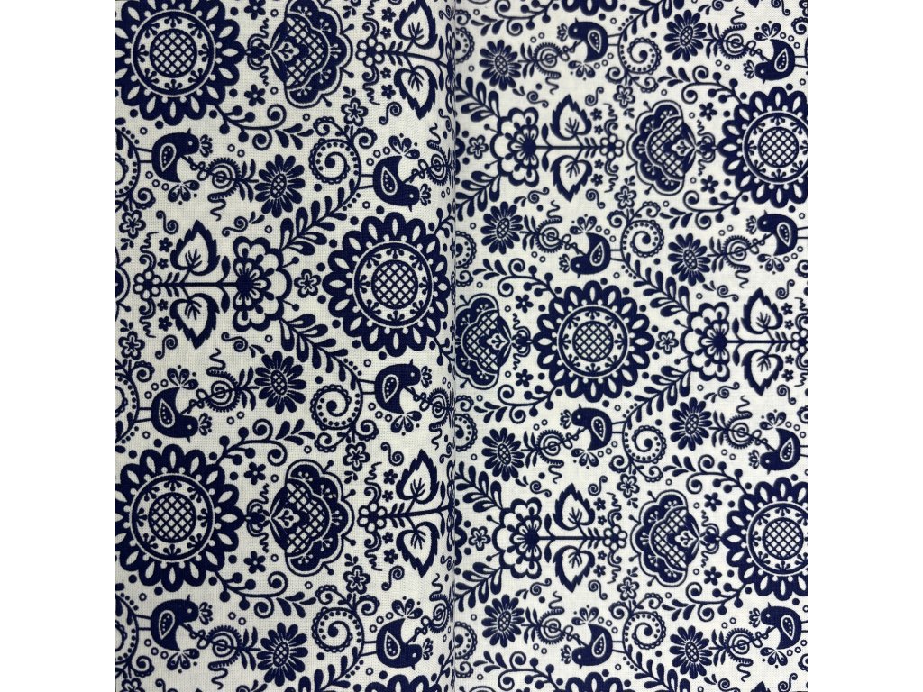 Tato dekorativní látka v čistě bílém odstínu je zdobena bohatým tmavě modrým folklórním motivem, který kombinuje květinové ornamenty, stylizované rostliny a drobné ptáčky.