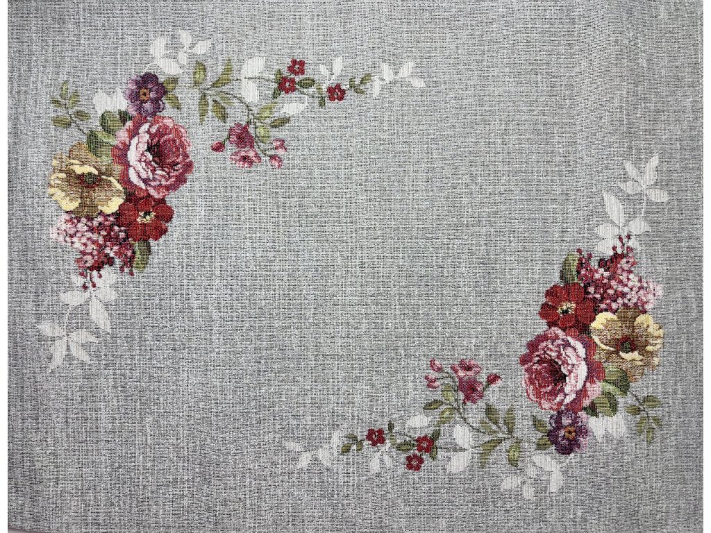 Design tvoří jemná, elegantní květinová kompozice s bohatými kyticemi růží, drobnými kvítky a listy, umístěnými v rozích a propojenými decentními větvičkami. Podklad v šedém melanžovém odstínu působí velmi vkusně, moderně a zároveň nechává krásně vyniknout barevné květy v tónech červené, růžové, krémové a zelené.