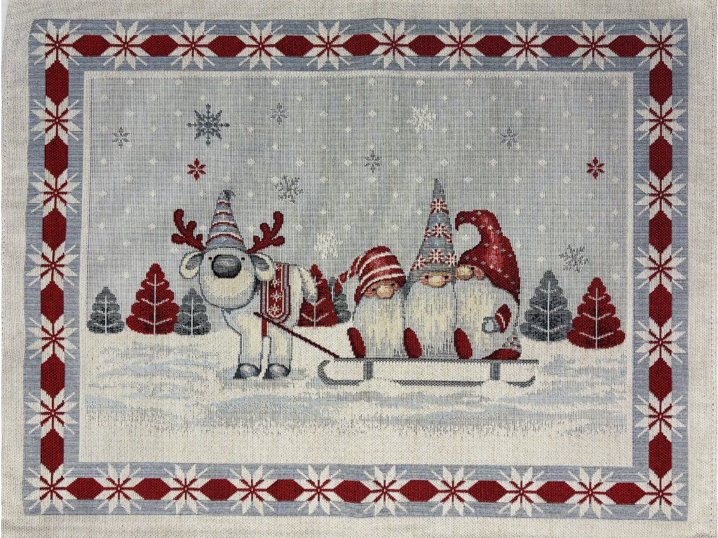 Toto gobelínové prostírání v jemném přírodním odstínu je zdobeno hravým zimním motivem dvou skřítků jedoucích na saních, které táhne stylizovaný sob.