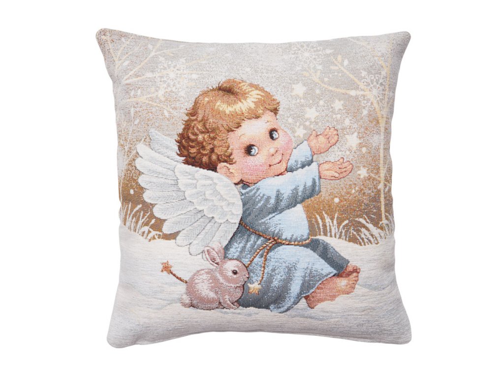 Gobelínový povlak na polštář s motivem andělíčka a zajíčka v modrém, který jistě potěší řadu velkých i malých andělíčků