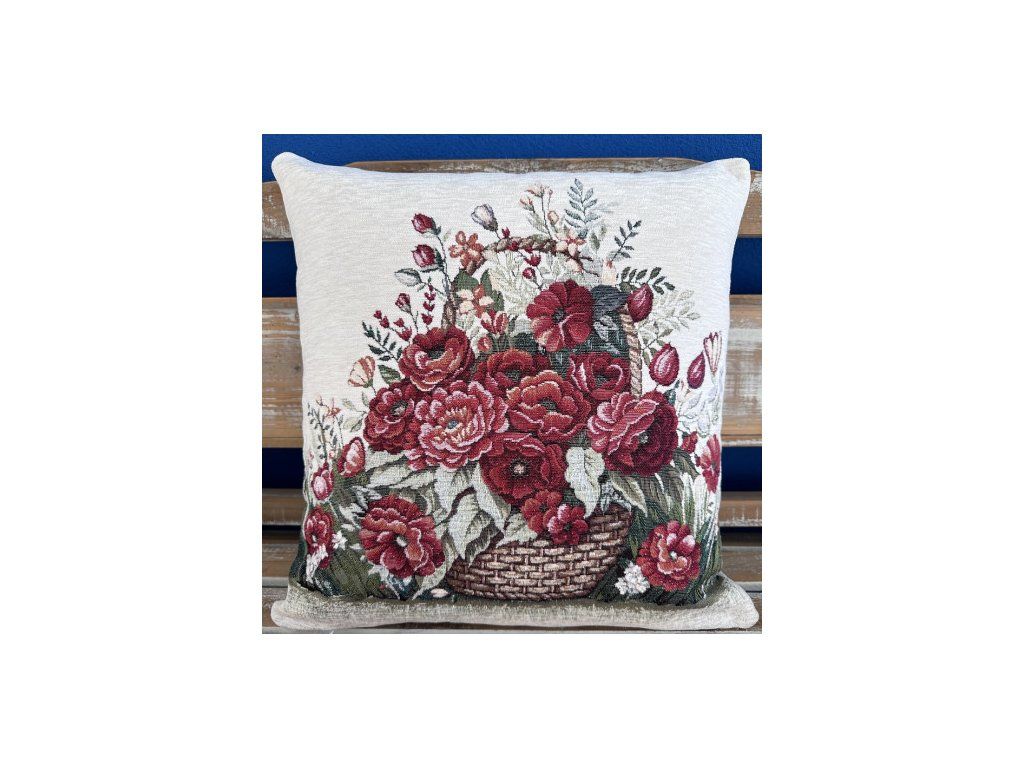 Elegantní dekorativní povlak na polštář z chenille látky s bohatým gobelínovým motivem rozkvetlé kytice vínově červených růží a dalších květů naaranžovaných v proutěném košíku.