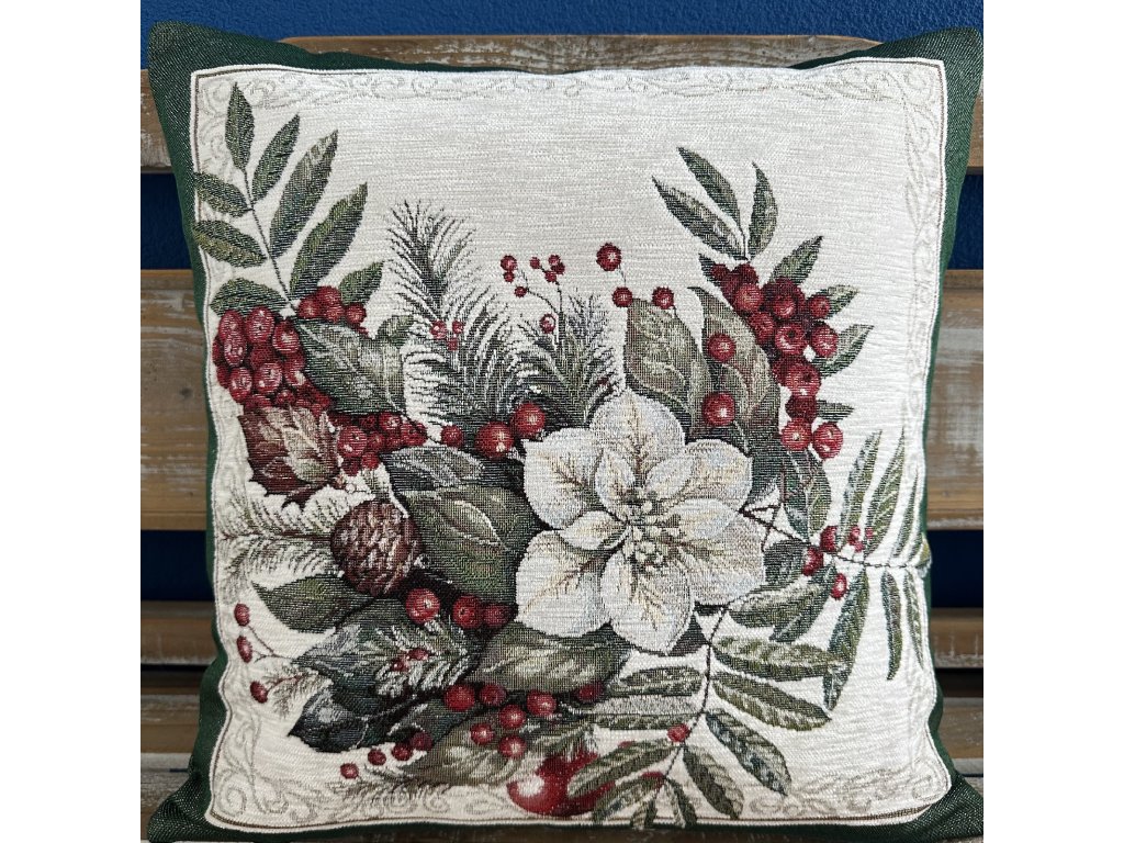 Tento elegantní vánoční povlak na polštář zdobí detailní tkaný motiv s bílou vánoční růží uprostřed bohaté kompozice červených bobulí, šišek, jehličí a tmavě zelených listů.