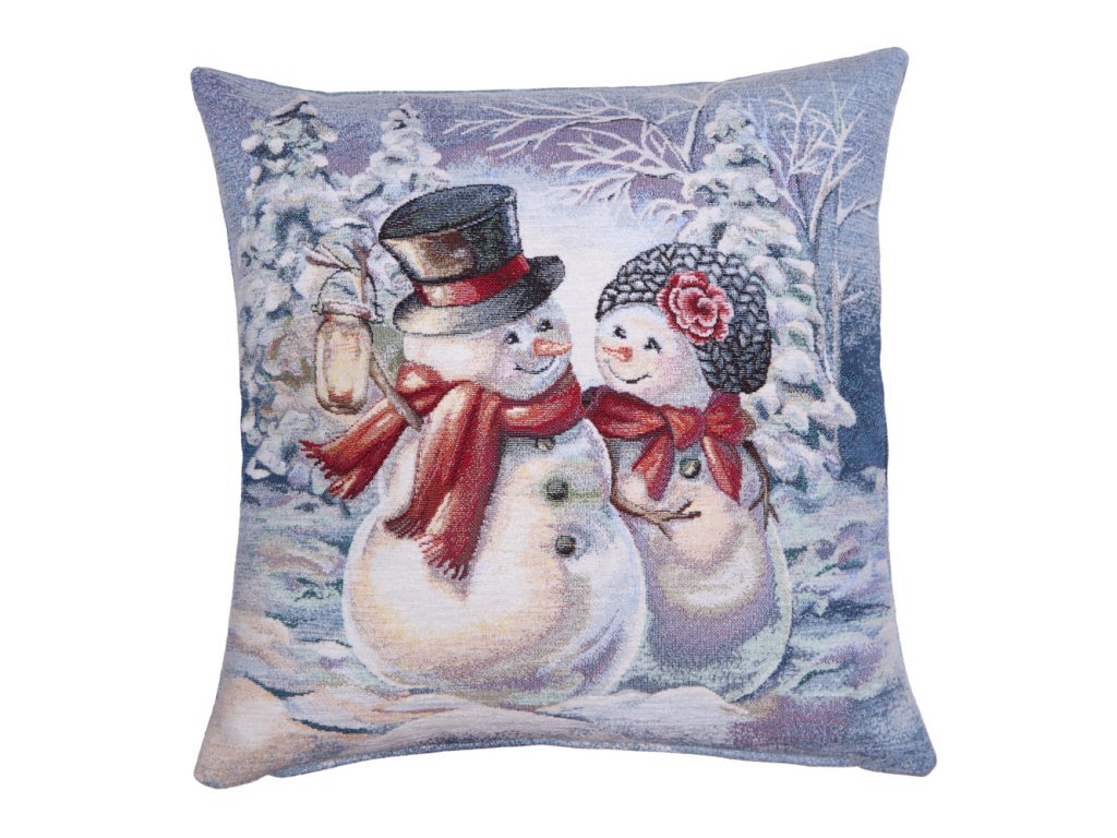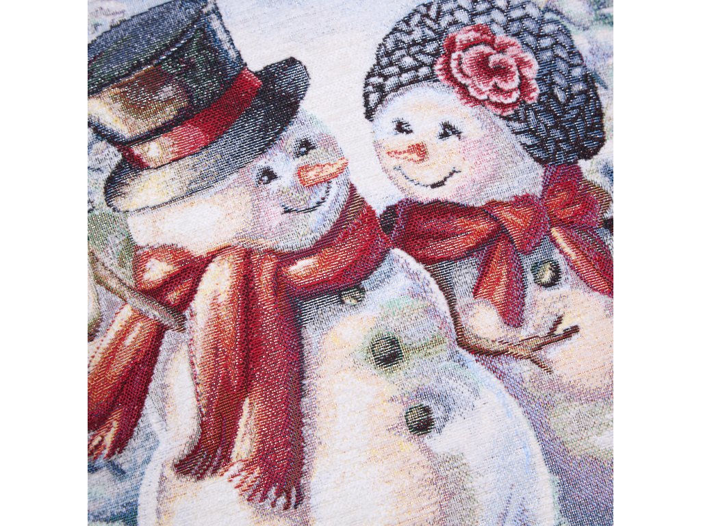 Na přední straně polštáře je detailně zpracovaný gobelínový obraz dvou sněhuláků oblečených ve vánočním oblečení, obklopených zasněženou krajinou a jehličnany. Barvy jsou teplé a pozitivní, od bílých a šedých tónů sněhu po jasně červené šály, které dodávají pocit tepla.