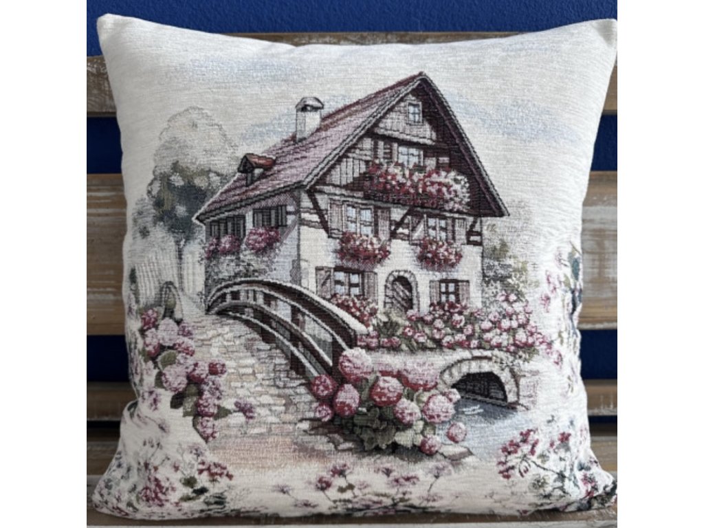 Gobelínový povlak na polštář chenille - venkovský domek s mostem
