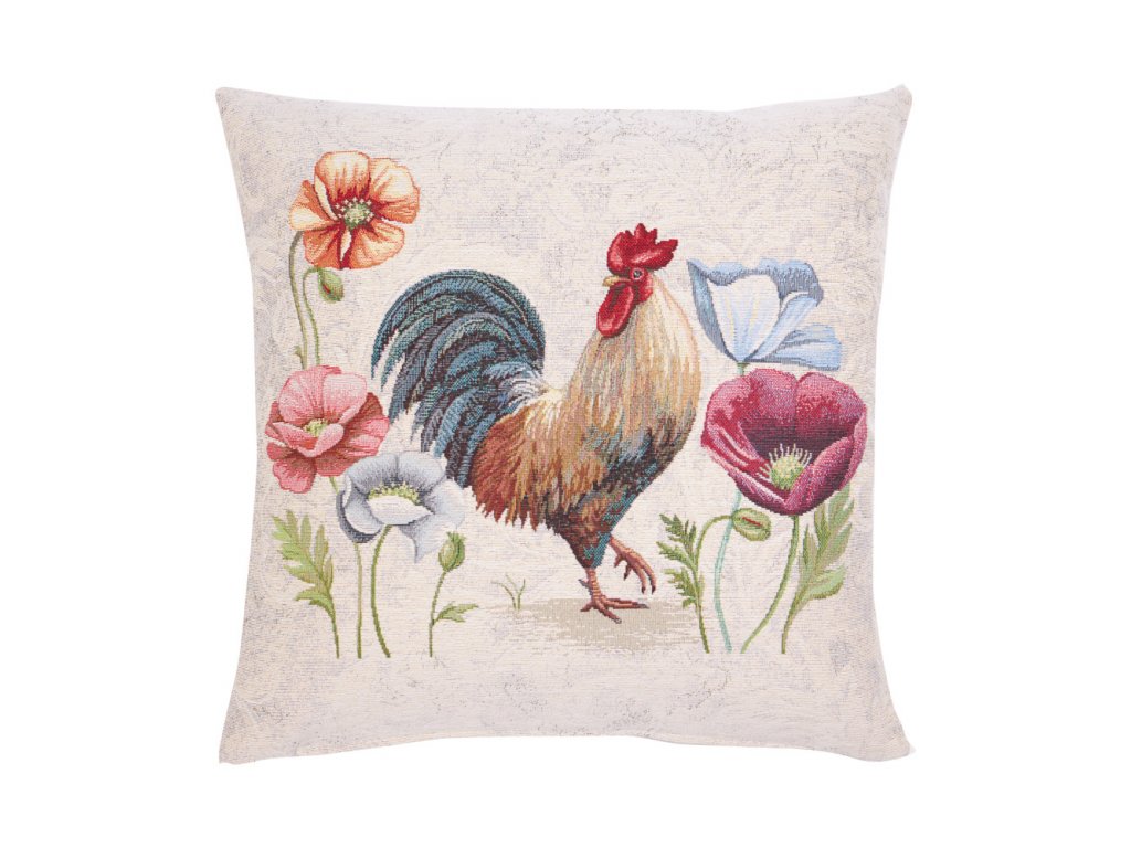 Vyšívaný gobelínový povlak na polštáře s motivem kohouta s květinami na béžovém podkladu. Díky tomuto krásně zdobenému gobelínovému povlaku na polštáře si můžete vyzdobit Vaši domácnost dle Vašich představ .