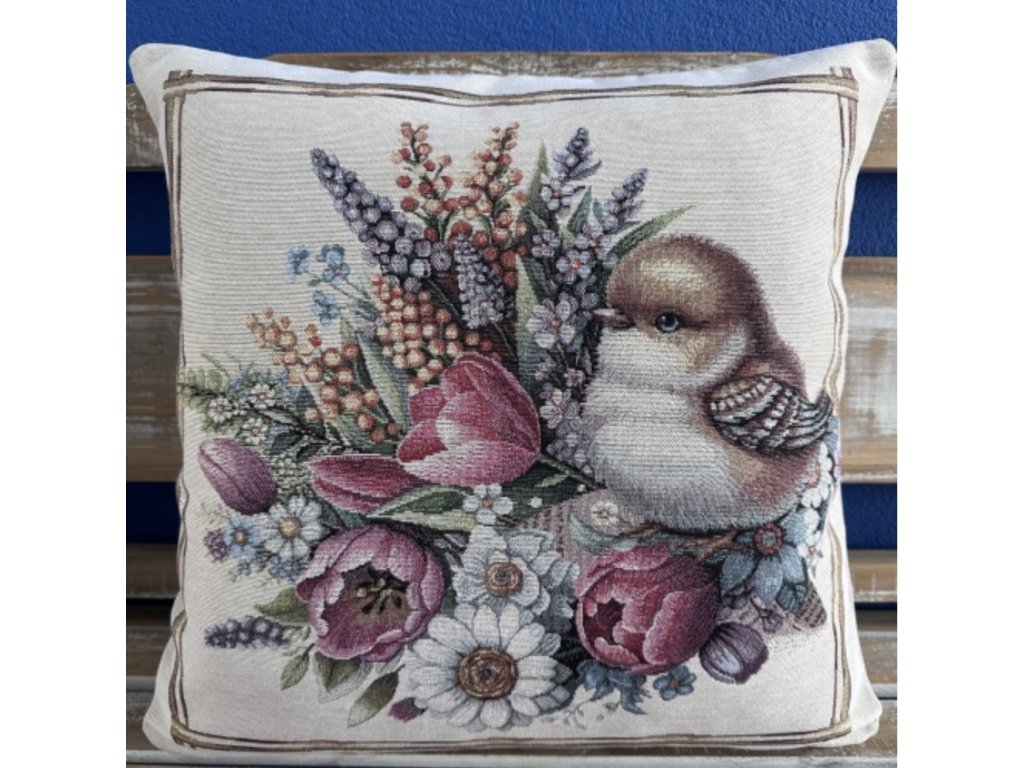 Gobelínový povlak na polštář - ptáček s jarní kyticí