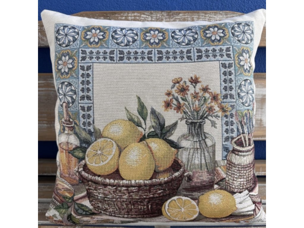 Dekorativní gobelínový povlak na polštář s bohatě tkaným motivem zátiší s citrony působí elegantním středomořským dojmem. Dominantou je proutěný košík plný zralých žlutých citronů doplněný o rozkrojený plod s jemně propracovanou dužinou, kolem kterých jsou rozloženy zelené listy.