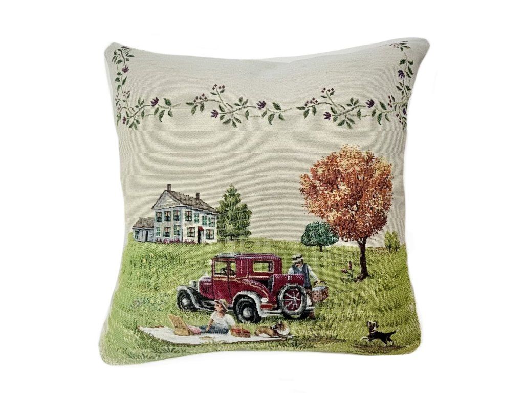 Tento dekorativní gobelínový povlak v jemném přírodním odstínu zaujme nostalgickým motivem venkovské krajiny s romantickou piknikovou scénou.