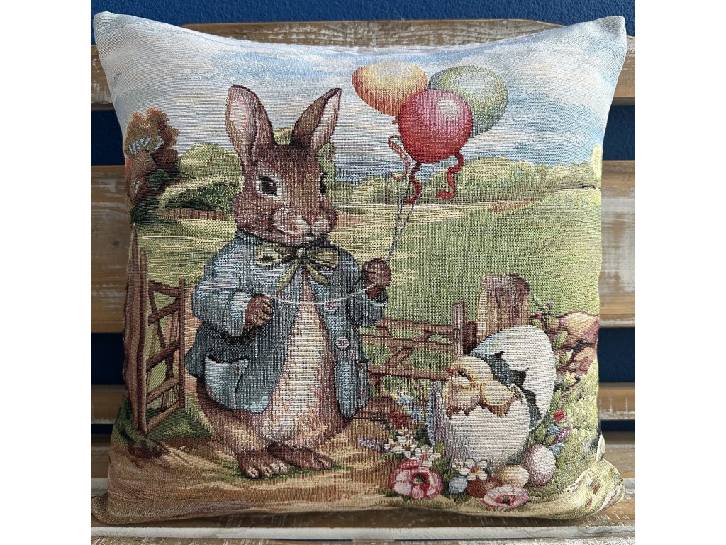 Tento dekorativní gobelínový povlak zaujme jemným velikonočním motivem v romantickém venkovském stylu.