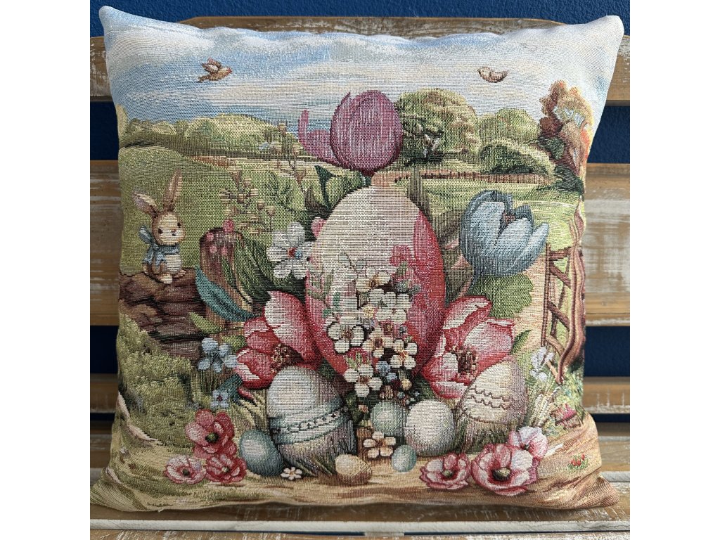 Precizní tkaný gobelín v pastelových barvách vytváří bohatý, plastický vzhled a navozuje hřejivou, pohádkovou atmosféru. Povlak je krásným doplňkem na pohovku, lavici či křeslo a skvěle vynikne jako sezónní velikonoční dekorace interiéru.