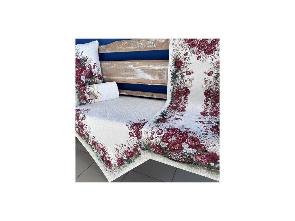 Květinové aranžmá v proutěných košících je umístěno po okrajích ubrusu a vytváří elegantní dekorativní lem, který krásně zvýrazní stůl, komodu nebo konferenční stolek. Světlý podklad dodává celému designu jemnost a umožňuje vyniknout detailně propracovaným květům v odstínech vínové, růžové, zelené a krémové.