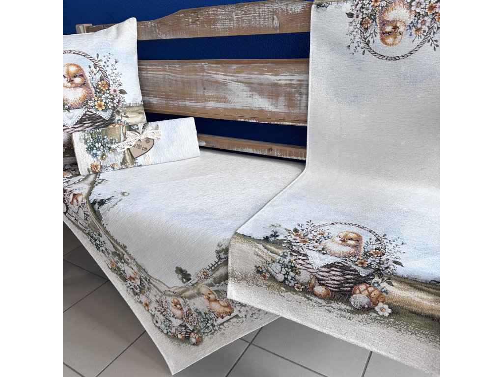 Tento dekorativní gobelínový ubrus zaujme jemným venkovským a velikonočním motivem. Je vyroben z pevné, kvalitní tkaniny s bohatou strukturou, která dobře drží tvar a působí luxusním dojmem.