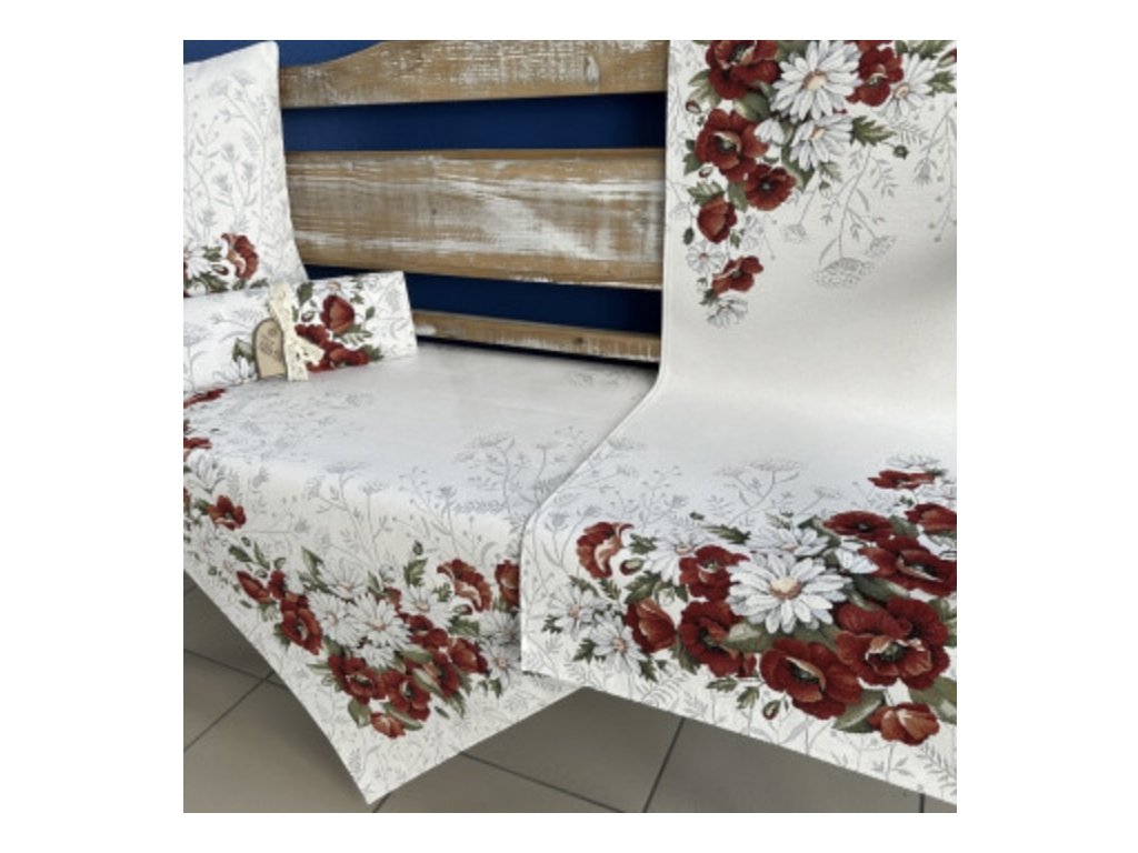 Vysoce kvalitní gobelínový ubrus s vlčími máky a kopretinami. Ubrusy jsou ušity ze speciální chenille látky, která je oproti klasickým látkám hebká a jemná na dotek.