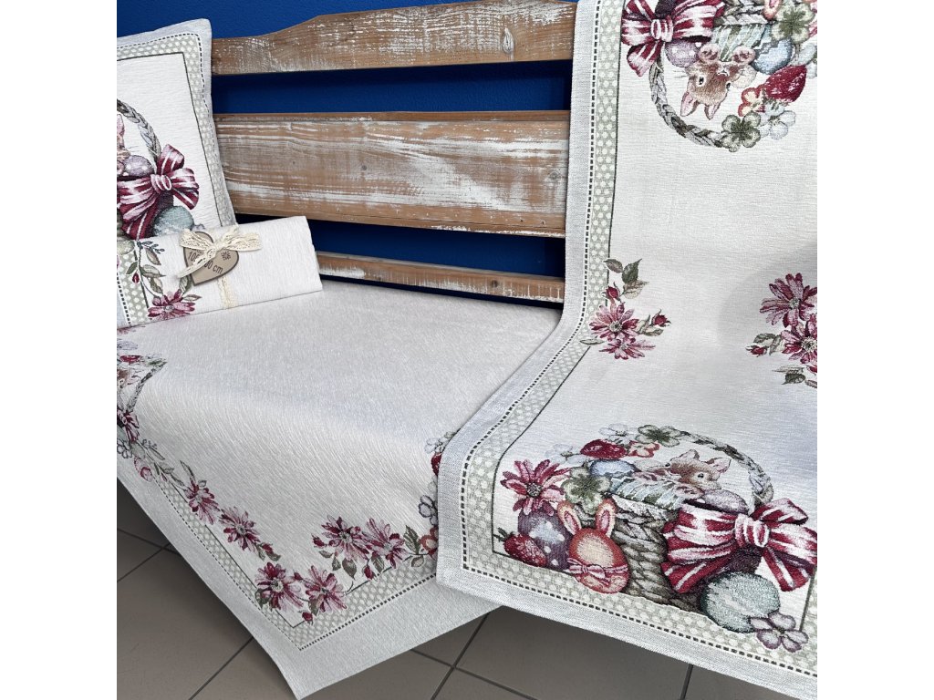 Tento dekorativní gobelínový ubrus je laděn do jemného jarního a velikonočního stylu s důrazem na bohaté detaily a harmonické barvy. Je vyroben z kvalitní pevné tkaniny s výraznou strukturou, která zajišťuje dlouhou životnost a elegantní vzhled. Světlý krémový podklad je doplněn propracovaným rámováním po okrajích, kde se objevují motivy roztomilých zajíčků, barevných velikonočních vajíček, květin a dekorativních mašlí.