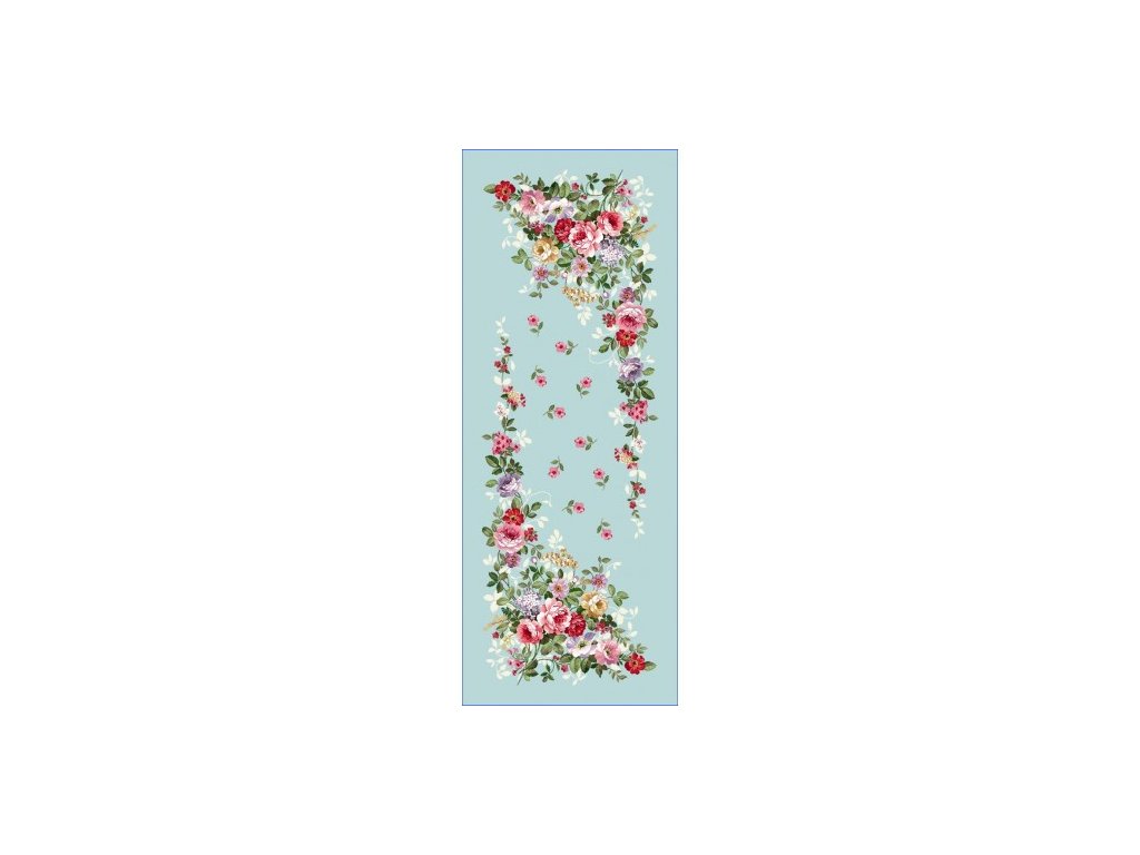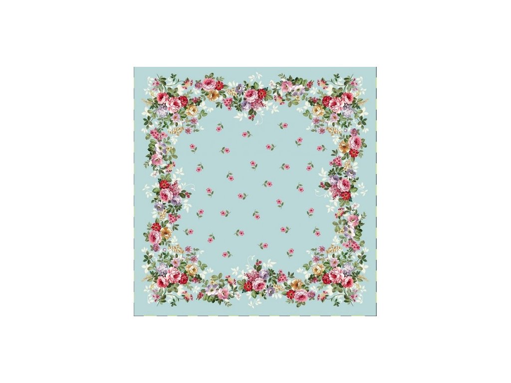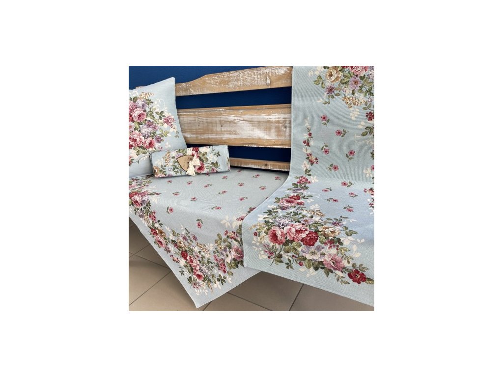 Vysoce kvalitní gobelínový ubrus s kyticí květů a lístků na světle modrém podkladu. Ubrusy jsou ušity z velmi kvalitního materiálu, který zaručuje velmi dlouhou životnost.