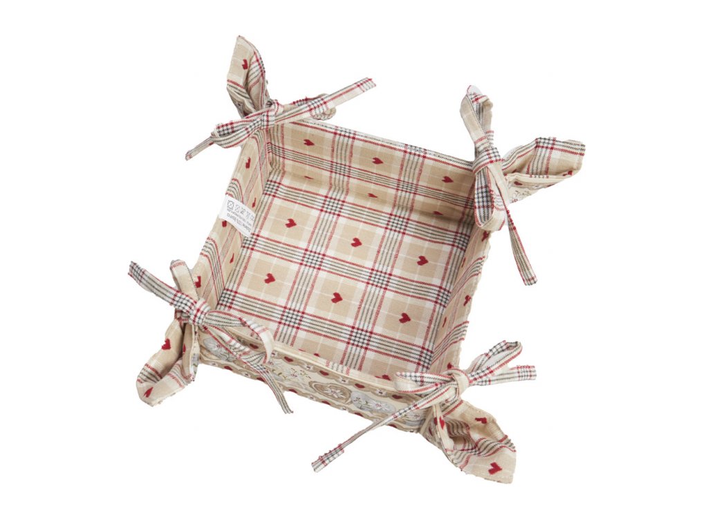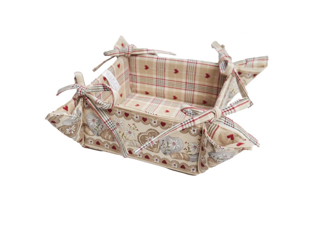 Gobelínový skládací košíček na pečivo, s motivem béžového kárování se srdcem a bílým obšíváním.