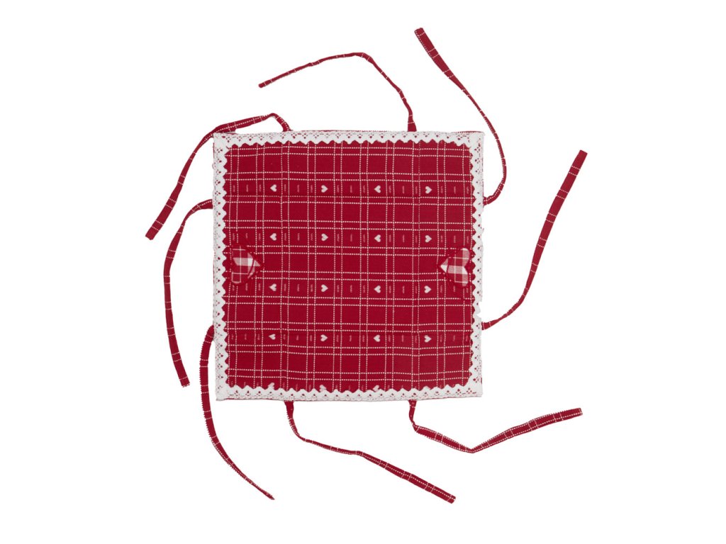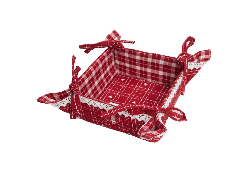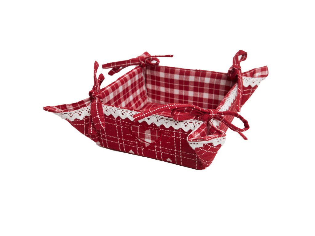 Gobelínový skládací košíček na pečivo, s motivem červeného kárování se srdcem a bílým obšíváním.