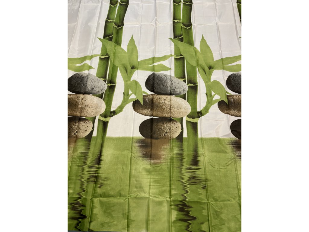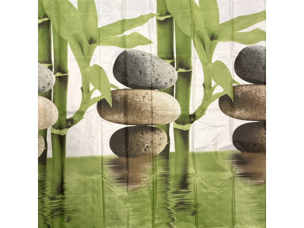 Tento koupelnový závěs přináší do interiéru uklidňující atmosféru inspirovanou přírodou a zen estetikou. Jeho realistický motiv zobrazuje zelené bambusové stonky v kombinaci s kameny naskládanými na sobě nad odrazem ve vodní hladině. Kompozice působí harmonicky a podporuje pocit klidu a rovnováhy, ideální pro relaxační prostředí koupelny.