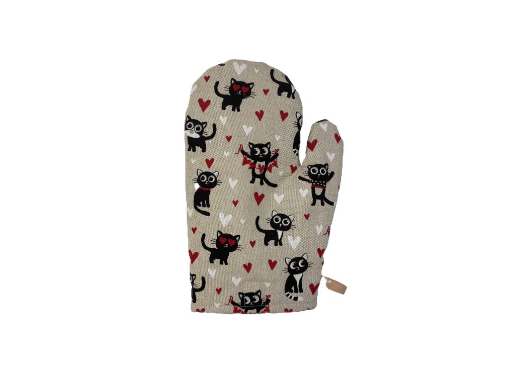 Tato kuchyňská chňapka zaujme veselým a roztomilým motivem černých koček doplněných červenými a bílými srdíčky na přírodně béžovém podkladu.