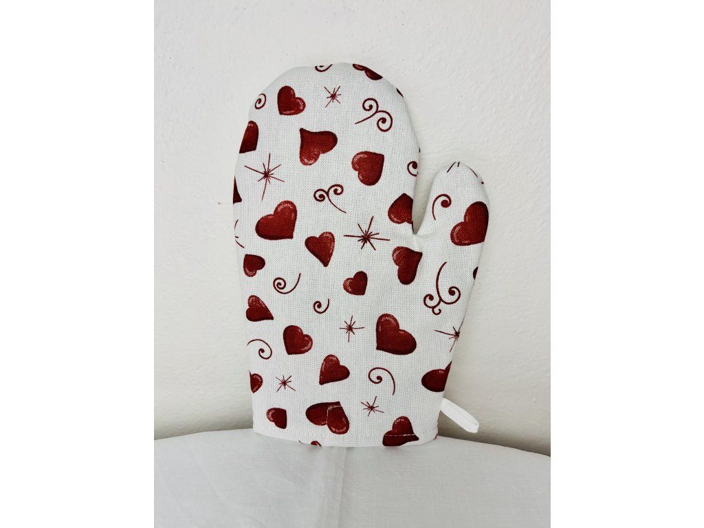 Kuchyňská chňapka v bílém odstínu je zdobená romantickým potiskem červených srdíček různých velikostí, doplněných o drobné hvězdičky a elegantní spirálové ornamenty.