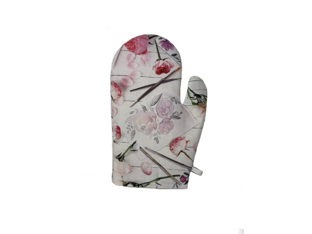 Tato kuchyňská chňapka působí velmi elegantně díky jemnému květinovému motivu v růžových a pastelových odstínech, který je doplněn realistickými detaily květů, lístků a drobných dekorativních prvků.