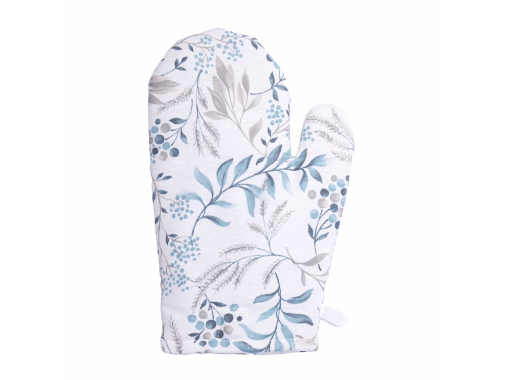 Pohodlná kuchyňská rukavice s motivem modrých a šedých lístků s bobulkami na bílém podkladu, která ochrání Vaše prstíky před popálením od horkých kastrolů, hrnců a pekáčů. Rukavice jsou vhodné pro leváky i praváky a jsou v univerzální velikosti.