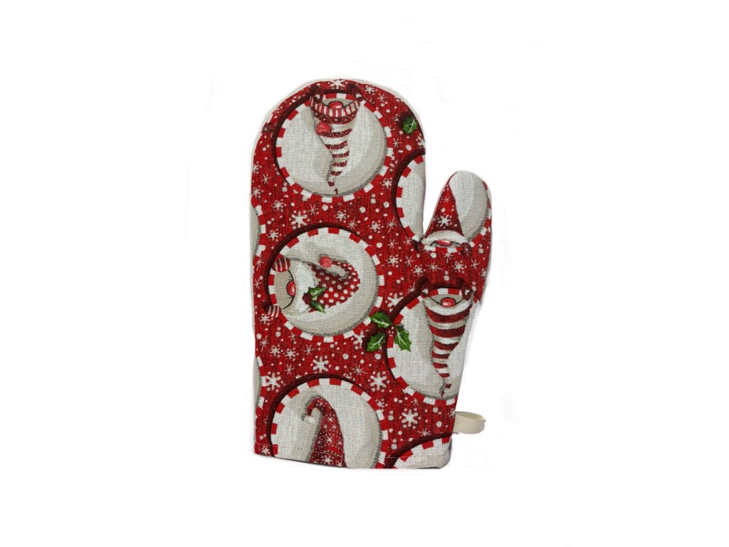 Tato kuchyňská chňapka okouzlí výrazným vánočním designem, který kombinuje roztomilé skřítky, sněhové vločky a dekorativní červenobílé kruhy.