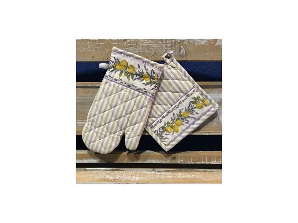 Je ušitá z kvalitní pevné látky s kombinací fialovo-žluté proužkovaného vzoru doplněného o motiv levandule s citróny. Vzor, který dodává celé sadě elegantní venkovský charakter. Chňapka je silně polstrovaná pro bezpečnou manipulaci s horkým nádobím, podložka slouží k odkládání hrnců či pekáčů a zároveň chrání pracovní plochu.