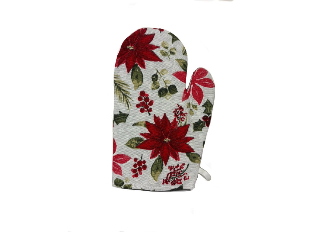 Tato kuchyňská chňapka přináší do vaší kuchyně slavnostní atmosféru díky nádhernému vánočnímu motivu s výraznými červenými poinsettiemi, zimními bobulemi a zelenými lístky.