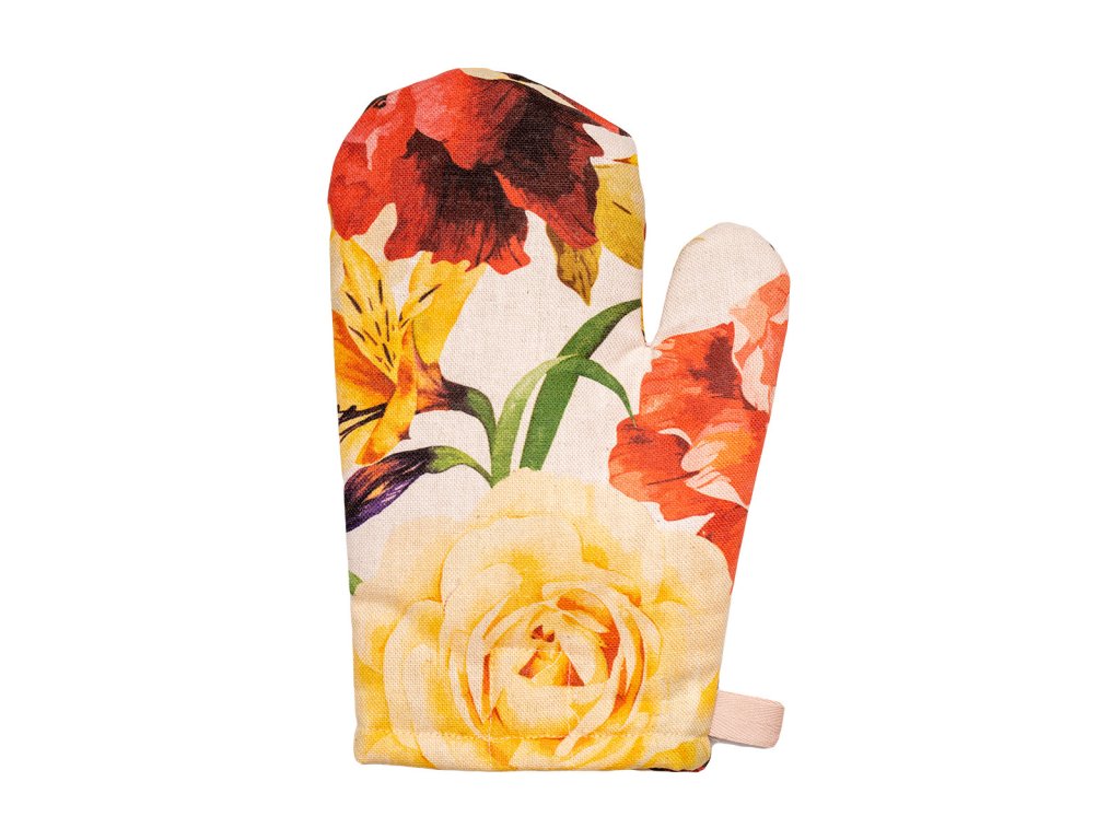 Pohodlná kuchyňská rukavice s motivem velkých červeno žlutých květů na bílém podkladu, která ochrání Vaše prstíky před popálením od horkých kastrolů, hrnců a pekáčů. Rukavice jsou vhodné pro leváky i praváky a jsou v univerzální velikosti.