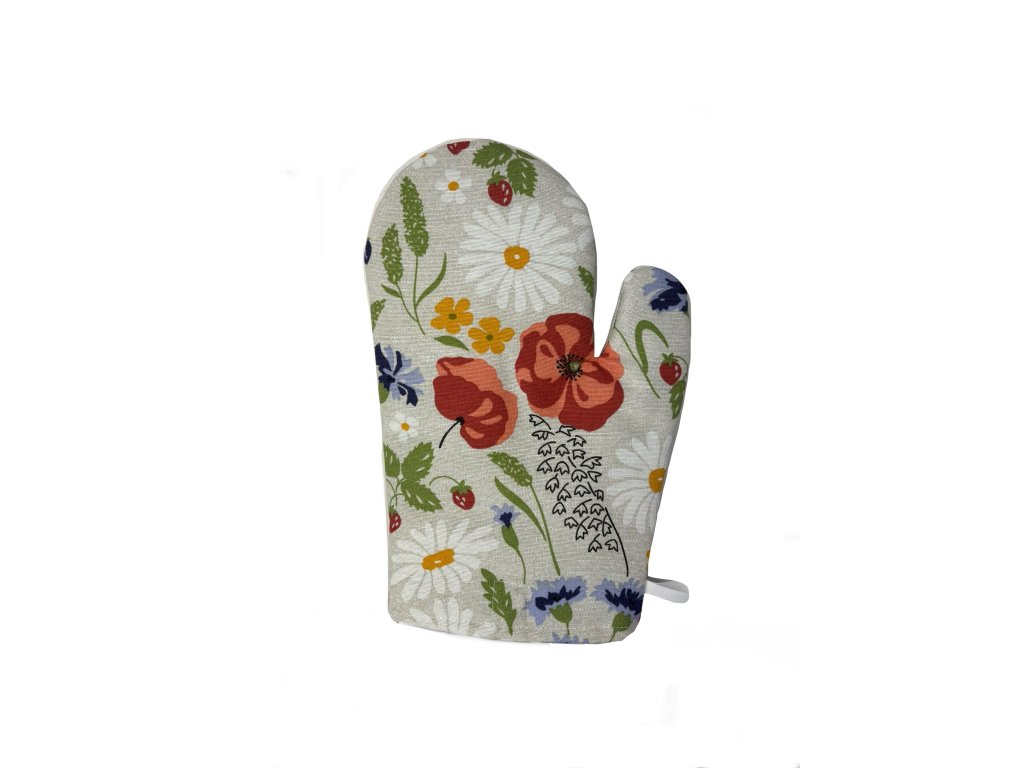 Tato kuchyňská chňapka přináší do kuchyně příjemný venkovský nádech díky výraznému květinovému vzoru, který kombinuje červené máky, bílé kopretiny, modré chrpy, drobné žluté kvítky a malé jahůdky.