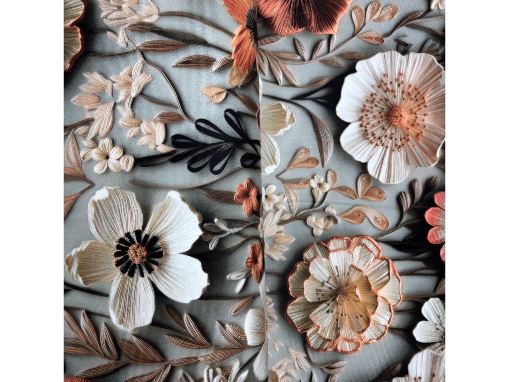 Tato elegantní závěsovina zaujme svým výrazným květinovým vzorem, který působí plasticky a téměř trojrozměrně. Velké květy v béžových, krémových, oranžových a hnědých tónech jsou doplněny jemnými lístky a drobnými kvítky, díky čemuž látka působí harmonicky a zároveň luxusně.