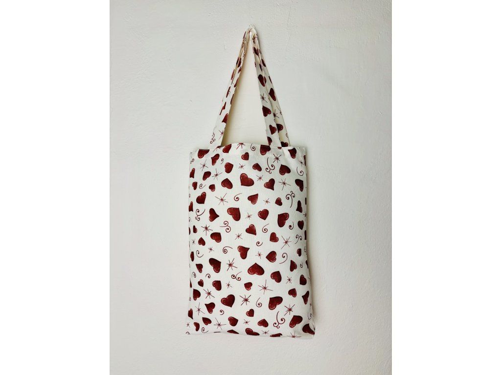 Elegantní látková taška v bílém odstínu je zdobená hravým potiskem červených srdíček různých velikostí, doplněných o drobné hvězdičky a spirálové ornamenty, které dodávají celkovému designu lehkost a romantický nádech.