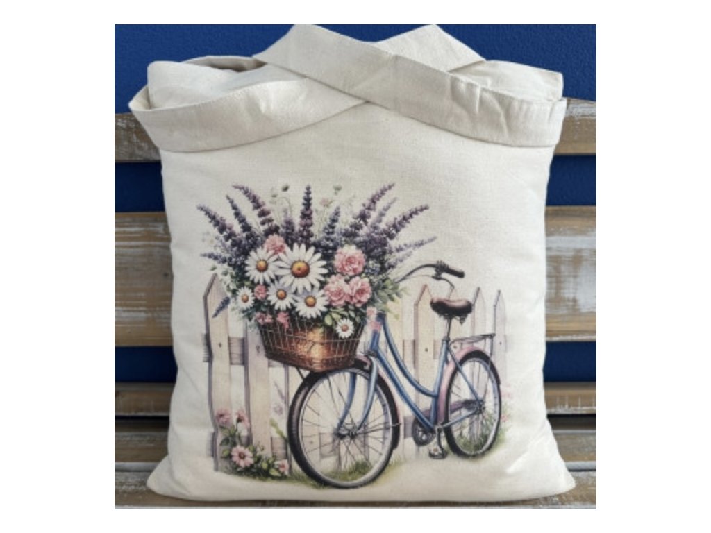 Na ilustraci je zobrazen modrý retro kolo opřené o bílý plot, s proutěným košíkem plným květin – levandulí, kopretin a růžových růží. Celý motiv působí jemně a romanticky, evokuje pohodu letních dní, kdy čas plyne pomalu a vzduch voní květinami.