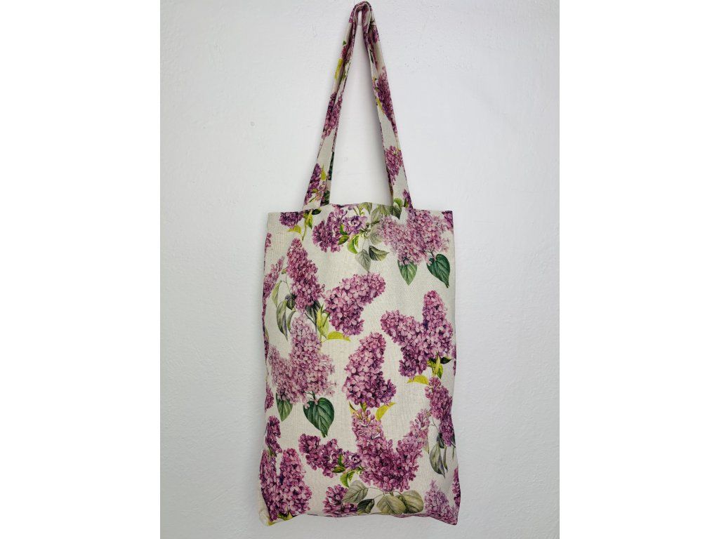 Tato látková taška v jemném přírodním odstínu zaujme bohatým a romantickým motivem rozkvetlého šeříku. Celý povrch je pokryt detailně zpracovanými květenstvími v odstínech fialové, růžovofialové a levandulové, doplněnými svěže zelenými listy.