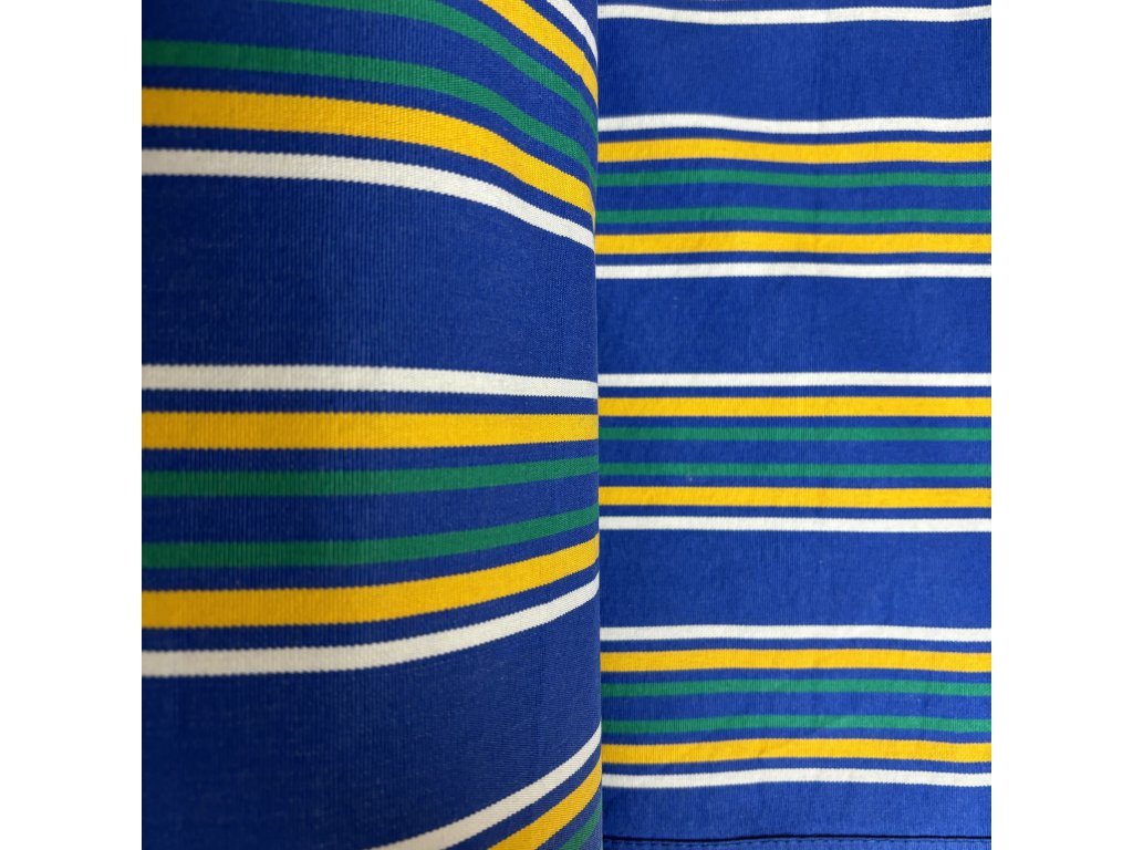 Sytě modrý podklad je oživen výraznými vodorovnými pruhy v bílé, žluté a zelené barvě, které vytvářejí svěží a letní vzhled ideální pro plážová lehátka, zahradní nábytek nebo slunečníky. Materiál je hustě tkaný, pevný a odolný vůči oděru i slunečnímu záření, zároveň však zůstává dostatečně pružný pro pohodlné sezení.