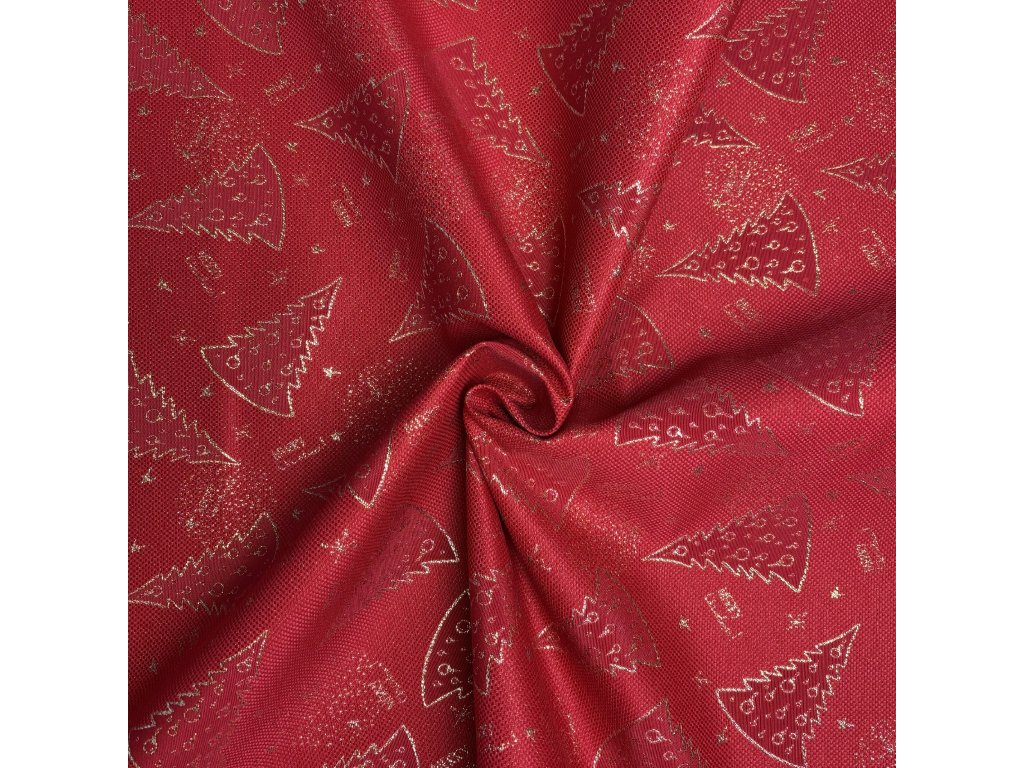 Tato červená vánoční lurexová látka je ozdobena zlatým motivem vánočních stromečků, hvězdiček a nápisů „Merry Christmas“, které se díky třpytivému lesku krásně odrážejí na světle.