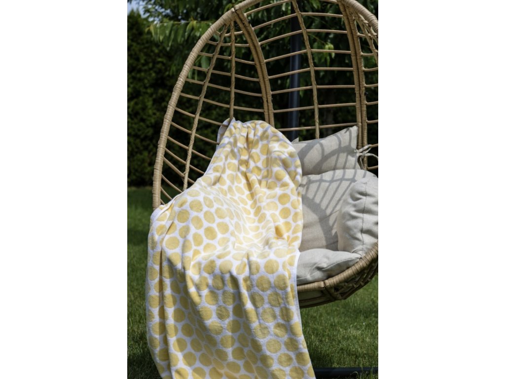 Plážová osuška s moderním a hravým vzorem žlutých puntíků na bílém podkladu je ideálním doplňkem k bazénu, na pláž i na zahradu.