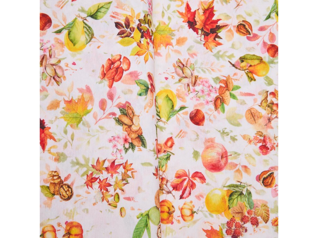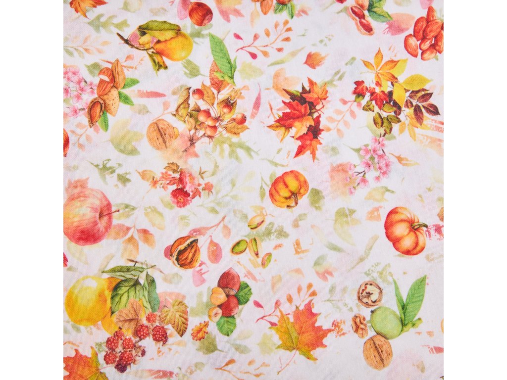 Tato podzimní režná látka zaujme přírodními motivy inspirovanými podzimní sezónou. Látka je zdobena ilustracemi jablíček, dýní, hrušek, lístků a dalších podzimních plodů. Je ideální volbou pro tvorbu dekorací, ubrusů, závěsů nebo kreativních textilních projektů, které přinesou do vašeho domova teplé tóny podzimu.