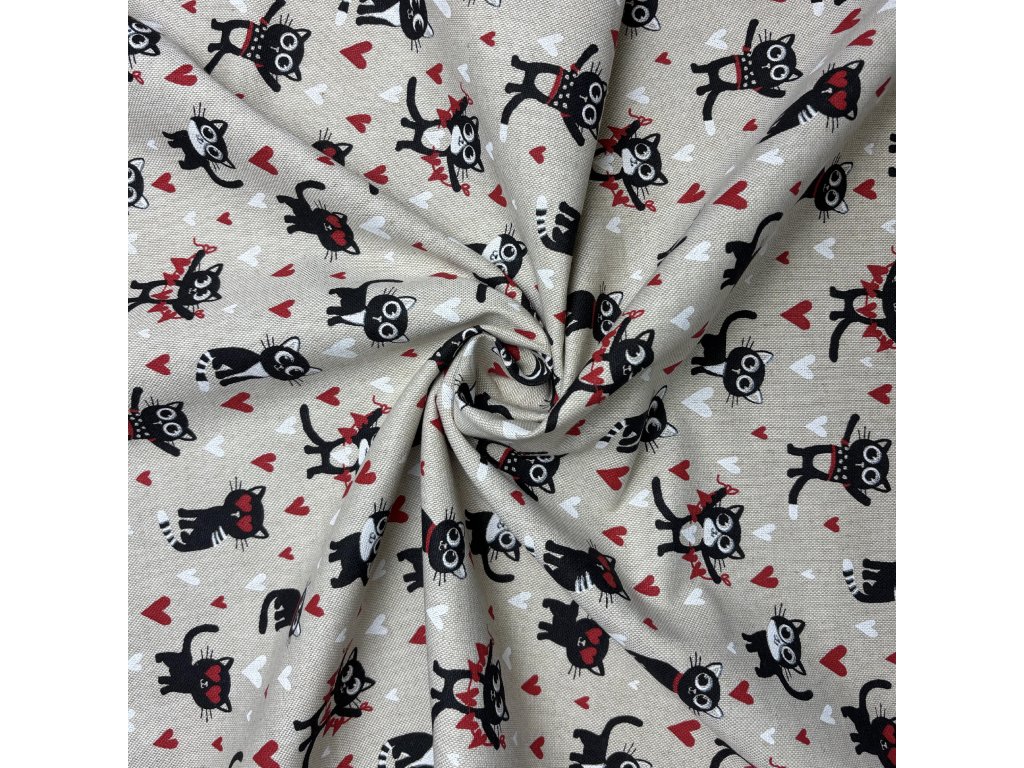 Tato roztomilá látka zaujme hravým motivem černých kočiček s velkýma očima, které jsou doplněny červenými a bílými srdíčky na béžovém podkladu.