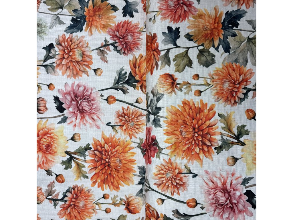 Květiny jsou vyobrazeny v sytých tónech oranžové, žluté, růžové a červené, doplněné o zelené listy, což dodává látce pestrost a svěžest. Jemný bílý podklad nechává květy krásně vyniknout a podtrhuje jejich podzimní kouzlo.