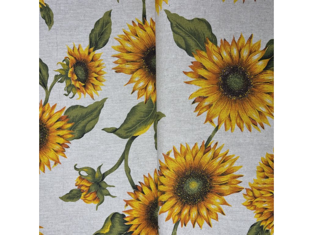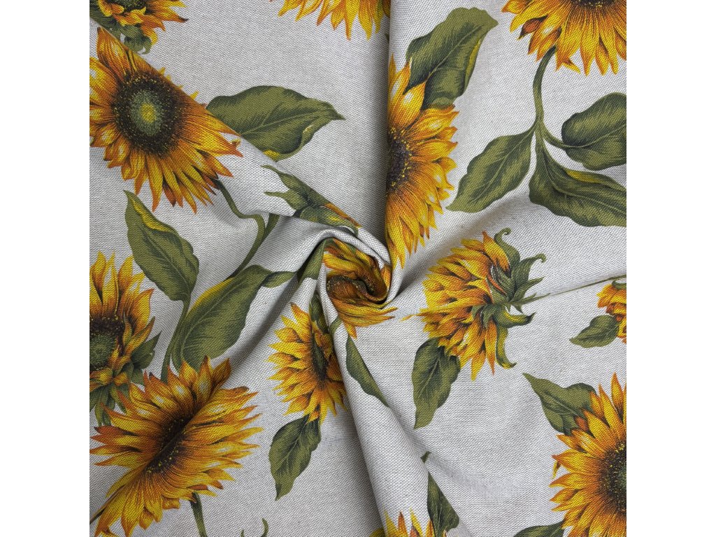 Tato látka přináší do interiéru zářivou energii a optimismus díky velkým slunečnicím v sytě žlutých a oranžových odstínech.