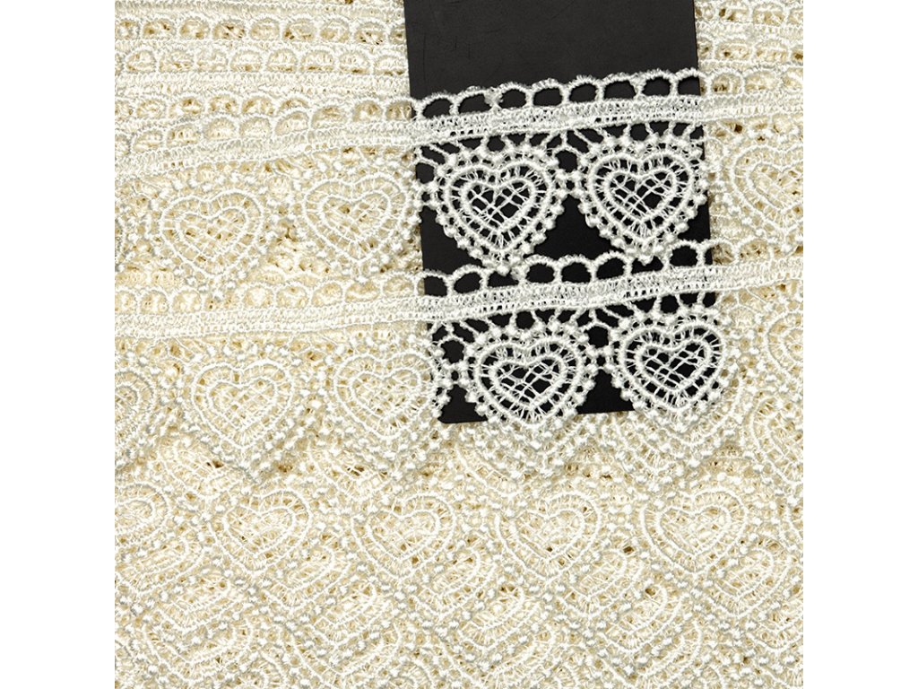 Polyesterové krajky se skvěle hodí pro dekoraci Vašeho oblečení či bytových doplňků. Krajka je krémové barvy se vzorem srdíček o šířce 3,5 cm. Díky této krajce si můžete snadno vyzdobit téměř jakoukoliv část Vašeho oblečení či např. polštářů, ubrusů apod.