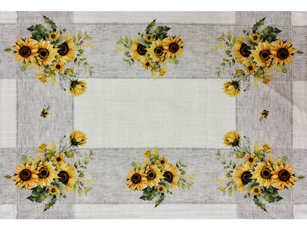 Hlavním motivem jsou bohaté kytice slunečnic s velkými tmavými středy a sytě žlutými okvětními lístky, doplněné zelenými listy, drobnými žlutými kvítky a jemnými větvičkami. Květinové aranže jsou rozmístěny symetricky po obvodu prostírání – větší kytice jsou v rozích a menší uprostřed horní a dolní strany, přičemž celý střed zůstává světlejší a bez výrazného vzoru, aby byl praktický pro prostření.